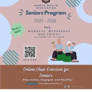 Online Exercises for Seniors Please email seniors@kanatamuslims.ca to register. Chair Exercises: Stay ... 13 Oct 10:40 AM - 11:20 AM Zoom