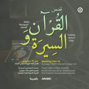 Sister’s Quran & Seerah Halaqah (Arabic) ✨ Weekly Sisters’ Class – قصص القرآن والسيرة ✨ Join ... 14 Dec 1:15 PM - 2:45 PM Kanata Muslim Association