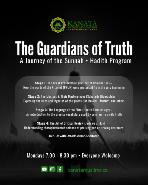 The Guardians of Truth is a special Hadith program that brings the study of the Sunnah to life through storytelling, reflection, and scholarly insight. Over four stages, we explore the preservation of the Prophetโs words, the lives and legacies of major Hadith scholars, the terminology used to verify truth, and the science of narrator evaluation. Join us with Ustadh Amar Abdifatah every Monday from 7:00 to 8:30 PM to deepen your connection with the Sunnah. Everyone is welcome.